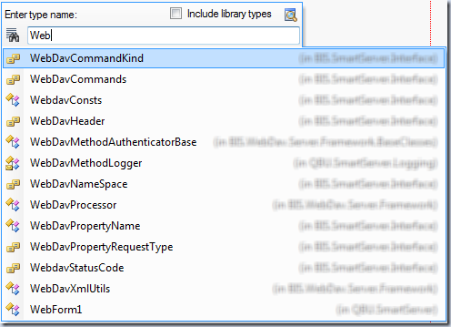 Another great feature of those options is acronym support. For example, I can quickly navigate to WebDavMethodLogger class by typing WDML (if the type name is Pascal Cased), or wdml in lowercase:
