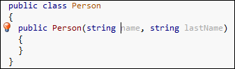 Notice two things here: the parameter names name and lastName are grayed out. It means that they are not (yet) used anywhere in our class. Also, notice the red bulb on the left side? That is my other best friend: the Action (Alt-Enter) key. Pressing Alt-Enter when will give this menu: