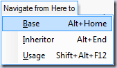 One of the most useful features that ReSharper provides is navigation to implementers from base classes, and vice-versa. By using Navigate from Here to (Alt-`) I get a popup which allows to quickly navigate to all implementations: