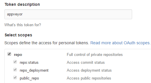 First, in order to deploy to our repo from AppVeyor, we need to create a Personal access token on GitHub. Go to https://github.com/settings/tokens, and click Generate new token. After entering your password for security purposes, create a new token with the repo permissions: