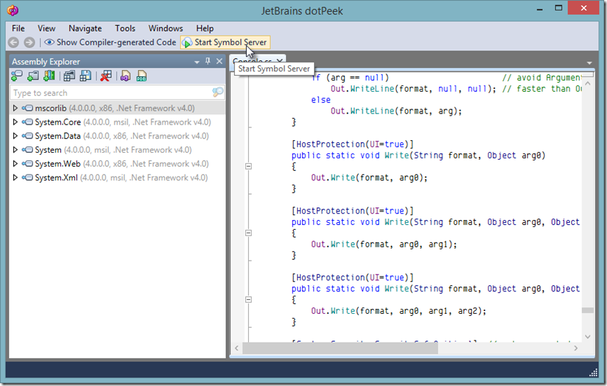 Sometimes, we wish we could just step into some 3rd party library, to figure out how it works, but we either don't have the source code, or otherwise just can't. Fortunately, this is made possible by dotPeek v1.2 that was just released, which can act as a symbol server for decompiled assemblies!