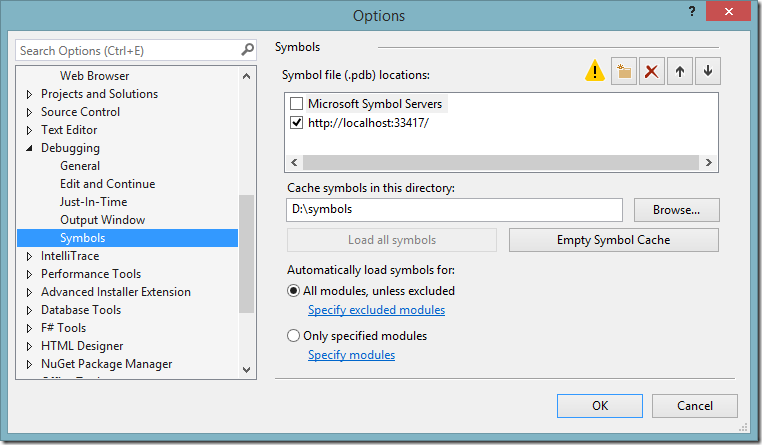 In addition, make sure that Just My Code (in General) is unchecked, and press OK. Some symbols will be loaded, this might take a few moments.