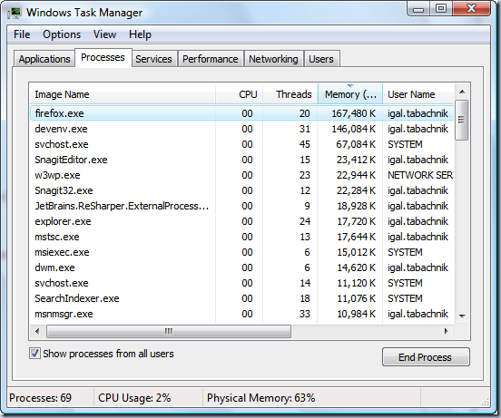 - Memory usage has dramatically improved! devenv.exe is no longer the hungriest process on my system, Firefox has regained its rightful place at the top of the Task Manager: