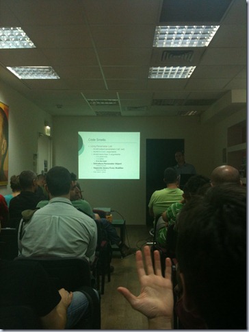 The main agenda for the evening was Bad Code: identifying bad code, code smells, and using tools to identify bad code. Uri gave an in-depth presentation about most common code smells, such as huge nested switch/case statements, and explained how to refactor them into a working, beautiful code.