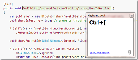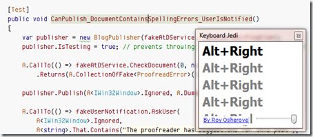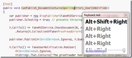 I'm using Roy Osherove's excellent Keyboard Jedi utility to demonstrate the keyboard shortcuts. Unfortunately it doesn't work on a 64-bit Windows, but you can fix it with this little hack by James Kovacs.