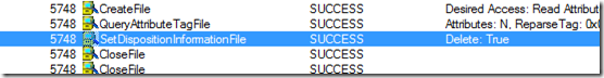 Feeling confused, I then started looking for anything that could appear relevant, until one entry in particular caught my eye: a call to SetDispositionInformationFile with a flag Delete: True.